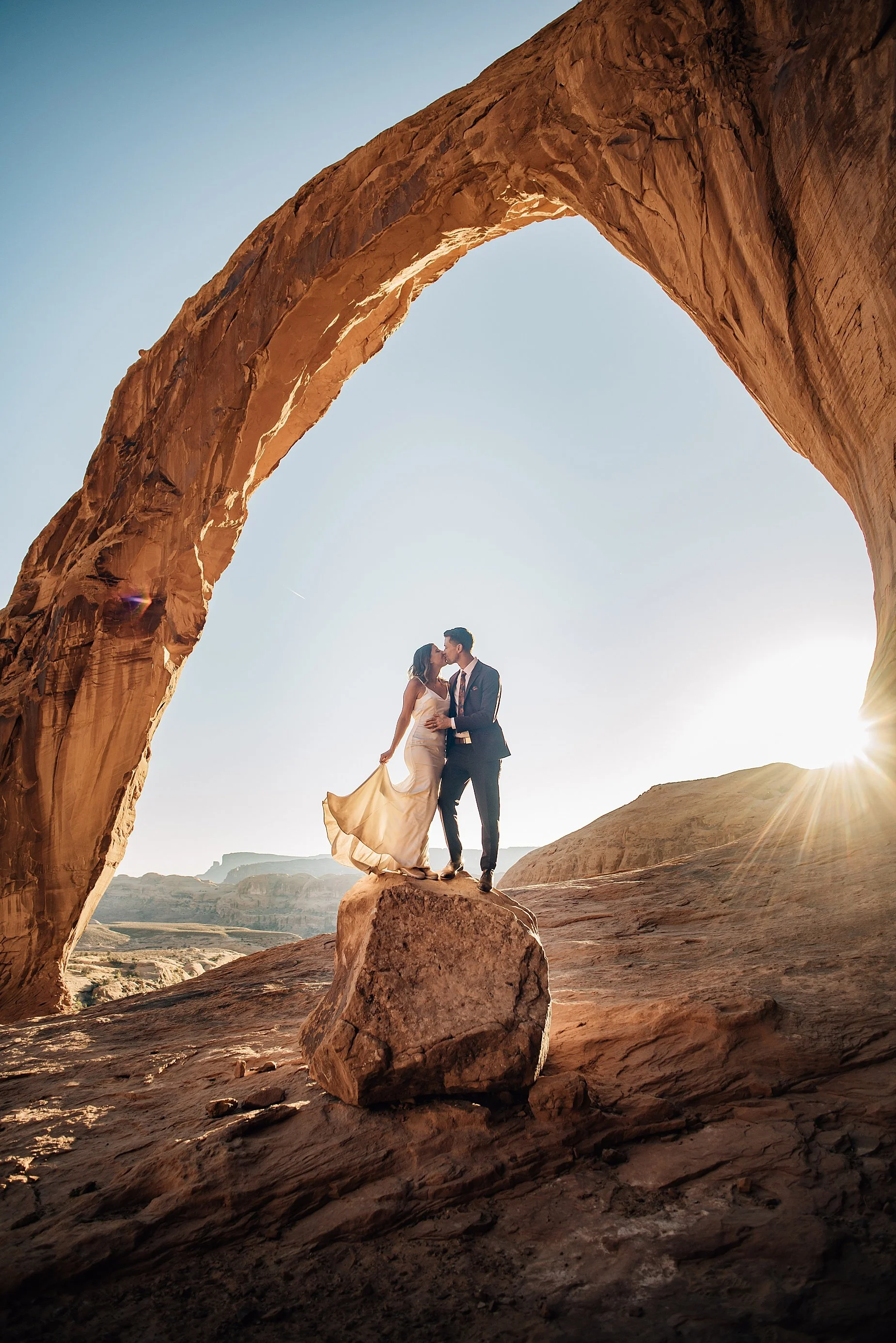 No matter your location, be prepared to hike in formal attire. Come ready with necessary gear appropriate to the season and comfortable walking or hiking shoes. Be ready to bring home some souvenir red desert dirt on your white wedding dress!